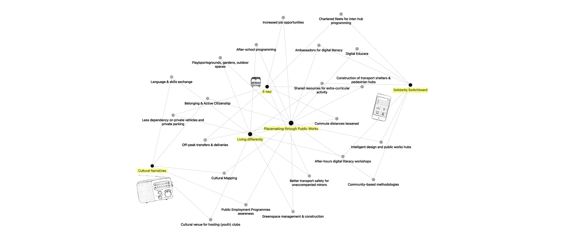 Facing dysfunctional public transport that reinforces segregation patterns from apartheid, the current system, which relies heavily on private vehicles, is approaching crisis. The existing minibus taxi system is plagued by safety issues, inefficiency, and lack of regulation. The E-Taxi provocation is a response to these issues around mobility within a fragmented city and its surrounds.The provocation proposes converting the existing minibus taxi system into “e-taxis” – digitally-enabled vehicles equipped with GPS, safety features, and a ride-hailing platform similar to Uber/Lyft. Rather than investing in new transport infrastructure like MyCiTi buses, they suggested redirecting funds to upgrade the current taxi fleet with smart technology, dedicated lanes, and integration with other transport modes. Additionally, these taxis could serve as delivery vehicles during off-peak hours to maximise their utility. While the group acknowledged implementation challenges around industry buy-in and regulation, they saw this as a more organic, bottom-up solution that could improve safety, reduce congestion, and better serve both low and middle-income residents.